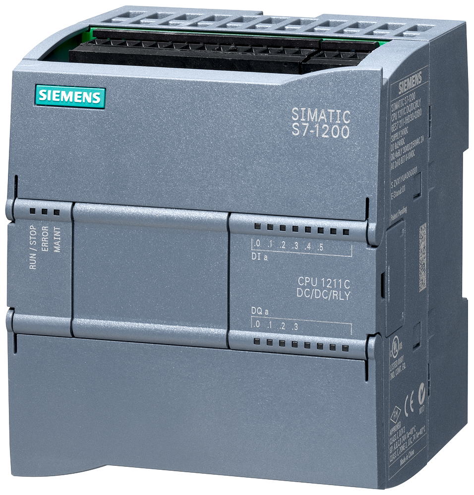 SIMATIC S7-1200, CPU 1211C, compact CPU, DC/DC/relay, onboard I/O: 6 DI 24 V DC; 4 DO relay 2 A; 2 AI 0-10 V DC, power supply: DC 20.4-28.8 V DC, program/data memory 75 KB